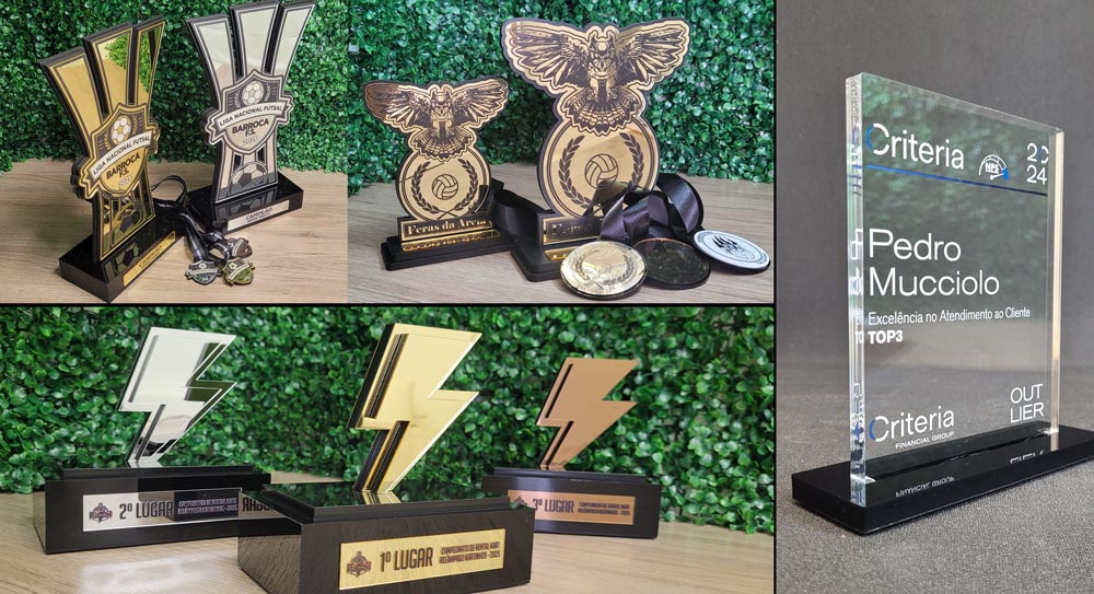Nossos troféus podem ser feitos em Acrílico, MDF, Madeira Maciça ou até mesmo com uma junção de diversos materiais.